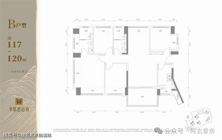117-120㎡四房两厅两卫(平层):改善主力,南北通透 + 南向三开间,主卧 270° 景观凸窗,四房设计满足多代同堂或 “三孩家庭”。