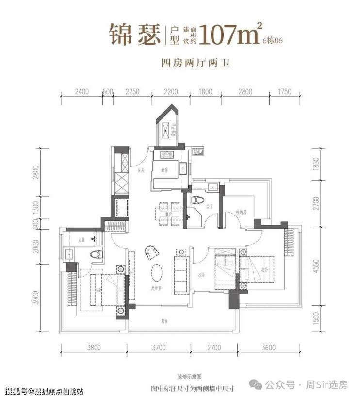 107㎡的4房2厅2卫,双龙抱珠格局,客厅3.7米开间,S墙预留冰箱位,四开间朝南,主卧+2个次卧270°无柱转角飘窗,分别做到了主卧17.94㎡/次卧16.38㎡/次卧7.56㎡/次卧6.89㎡(包含墙体飘窗),U型厨房烟道外置,得房率约104.06%(包含赠送),客厅连接次卧出超大阳台约11.76平,东北朝向。