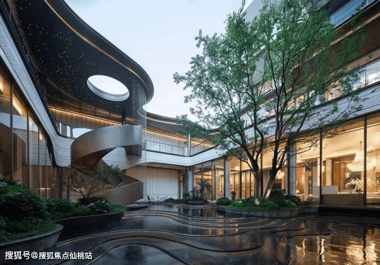 横向约67米、约7.5米高、如凤凰展翅的安缦风艺术门庭,异形处理的香槟色铝板屋檐、大面积大理石立面、黑金沙石龙鳞水波铺砖、高悬的明月园灯,拉满顶尖学府的归家排面。它不仅是建筑的起点,更将建筑、社区入口与地下车库入口完美地融合为一个整体。