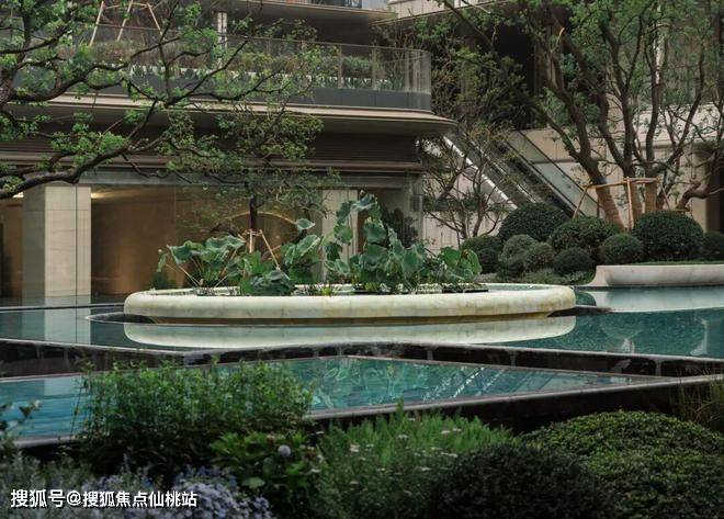 庭院景观以西湖荷花为核心设计元素之一,水桥的形态则借鉴并转译西溪湿地的自然肌理,使整体空间在文化意象与自然特征之间建立关联。