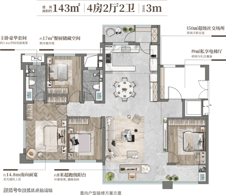 (3)建面约143㎡越级改善大四房,让奢享融入日常,定义高端人居标准: