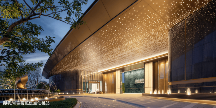 在铺装设计上,通过天然石材搭金属嵌条的艺术切割,以低彩度高级色系形成简约且富有层次感的精英风格。铺装纹理的深浅变化与无缝拼接的圆弧、交错线条,增强精致的节奏感,同时在铺装细节中融入抽象扇纹,意在表达岭南精致、迎宾的质感。