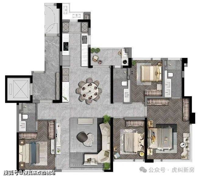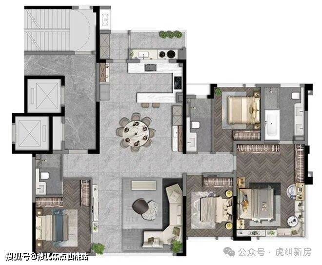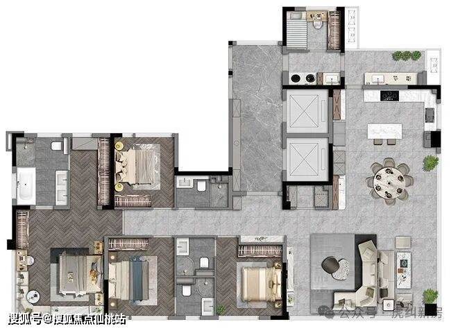 186㎡户型,主卧配置浴缸、双台盆设计、办公书桌,按照酒店式套房来设计。加上转角飘窗,犹如五星级酒店体验感。