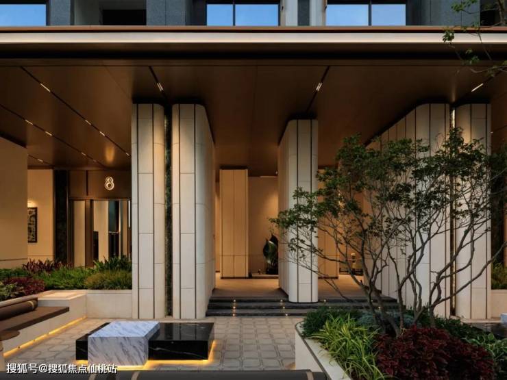 艺术柱廊通过宽敞通透的空间设计,结合顶级月光米黄石材打造的立柱与绿植,创造出既私密又开放的休憩区。精心布置的座椅为住户提供了一个舒适的社交与休闲空间,提升了整体居住体验。