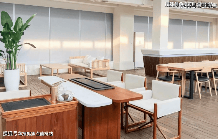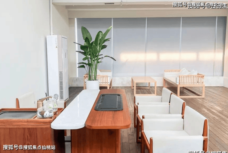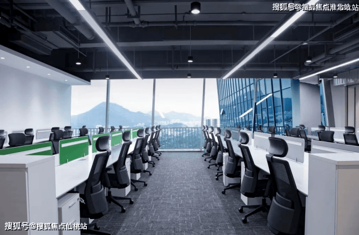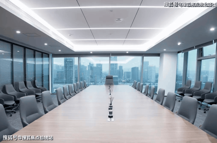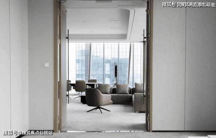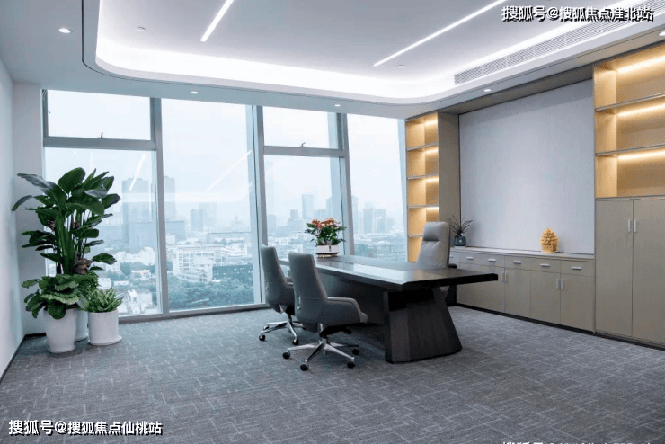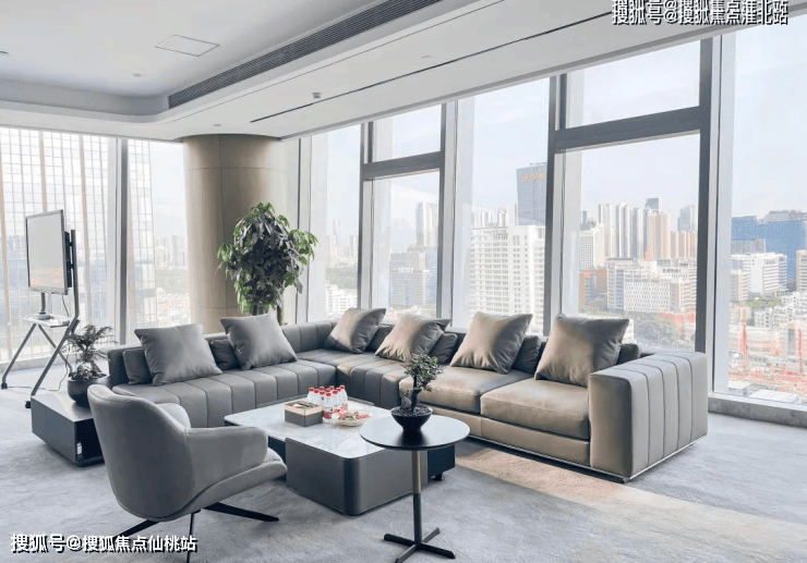 会客区以中性色为基础,搭配深色木质家具配件,四周全景落地窗照亮整体会客区,地毯的选择让整个区域整洁感升级,整体环境明亮、大气。