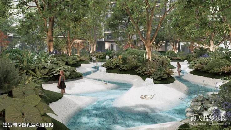 在悦海棠,每一次的归家之旅,都是一场松弛愉悦和找回自我的旅程。这里将溪流、森林、峡谷、草坡等自然场景融入园区,打造自然森境,完成从视觉到触觉的“自然包裹感”,构建“一芯两轴五园”的景观格局,配置20+互动景观节点。