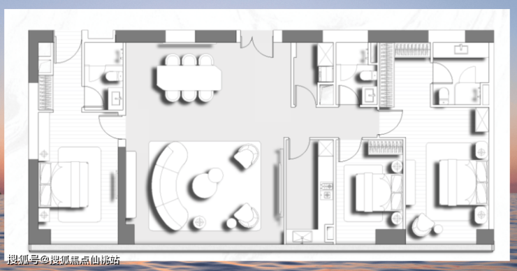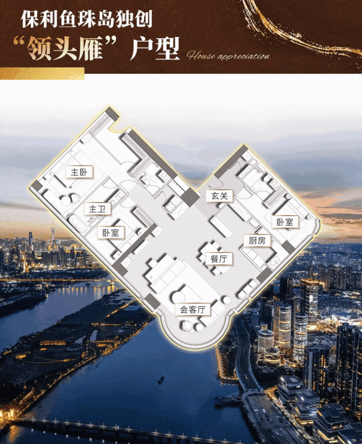 保利通过“领头雁”户型,做到270°弧形观江客厅、弧形主套、多卧室观江,还把珠金琶变成IMAX级巨幕。