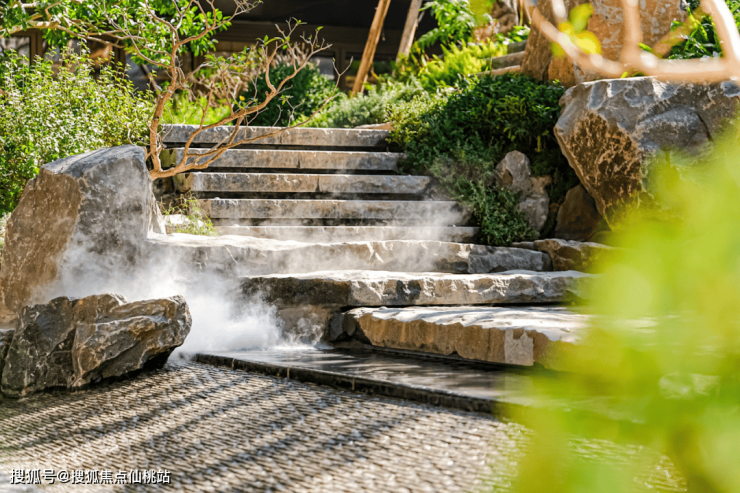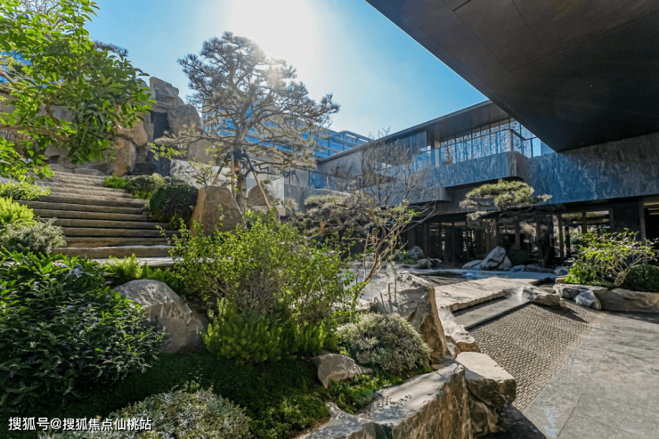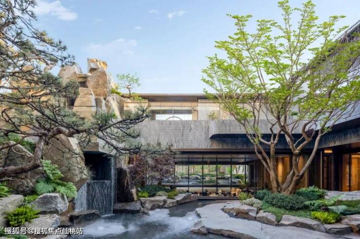 走出余荫山堂,视野豁然开朗,保利辰园·湖境的核心景观——中天云庭岭南下沉式庭院映入眼帘。庭院设计参考了南宋画家李唐的《万壑松风图》,用层层山石、流水瀑布和苍松,打造出高低错落的立体景观,还原了画里的山水意境,感觉瞬间走进了自然。