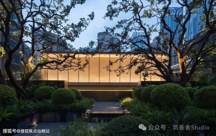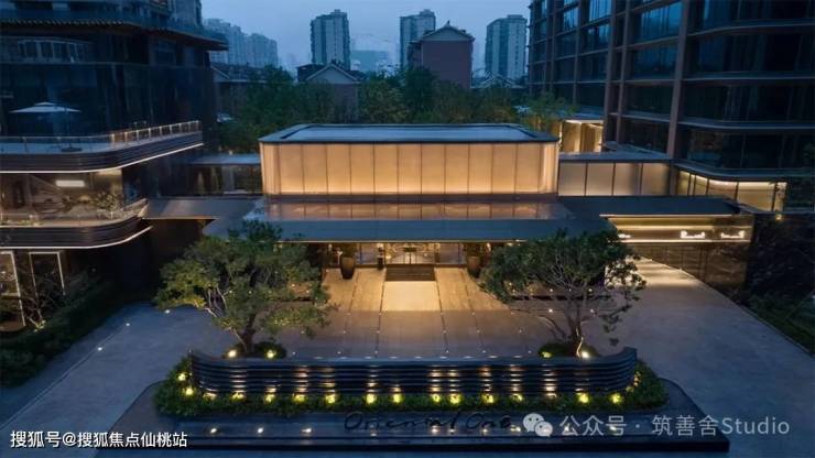打造36米奢阔面宽、9米挑高的翡丽门庭,以其高端雅致的风范,重塑金融中心都会景观。采用香槟金色不锈钢立体编织的金属网造型,于阳光照耀下散发出璀璨而半透明的柔和光泽。8米宽阔的悬挑雨篷,高达4.8米的挑空设计,彰显豪门气象。雨篷之下,立体双曲线金属叶片巧妙翘边,搭配定制180°灯具的柔和光晕,营造出温馨轻盈的归家氛围,并以焦点符号——盛开的杜鹃花,增添一抹自然雅韵。
