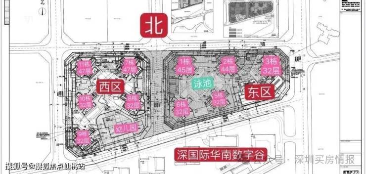 东区:占地约2.1万㎡,容积率5.28,包含住宅、商业、文化活动室、老年人日间照料中心和其他基础配套设施。1栋、2栋总高47F,3T6户;3栋、5栋总高32F,2T6户;6栋总高32F,2T5户;4栋属于商业,总高2层。