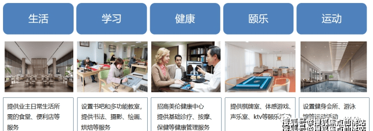 颐乐商街、便利社区、颐乐食堂、迎宾阁、长者陪伴中心、静态教学楼、动态教学楼、精修堂、国际幼儿园、足球场、健身运动馆、艺乐讲堂、门球场、西餐厅、棋乐轩、小礼堂、健康促进馆、恒温泳池、网球馆、颐乐农场