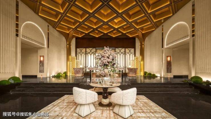 门庭,是恭迎八方来宾的第一空间。项目以非凡尺度,铺陈一场奢华的迎宾仪式——抵达之时,约51米恢弘跨度的「金风玉廊」率先映入眼帘,20根7米香槟金立柱巍峨耸立,尽显气度与庄重。