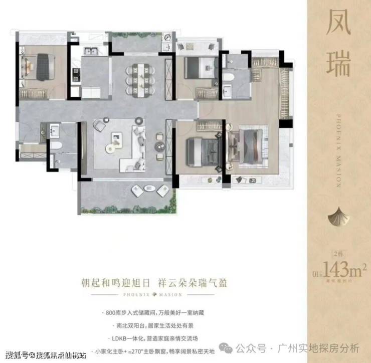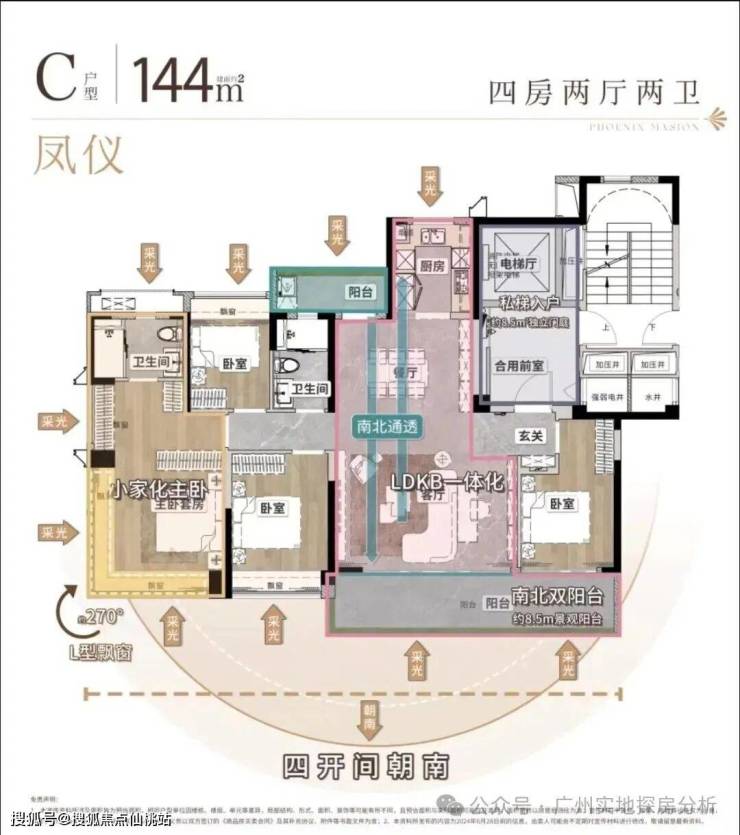 约144㎡四房两厅两卫,私梯入户,享约8.5㎡ 独立门庭!约8.5m南向景观阳台+北向生活阳台,南向四开间,约100%使用率。