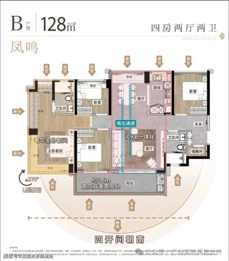 约128㎡四房两厅两卫,南向四开间,约7.5米双面宽阳台,约100%使用率。