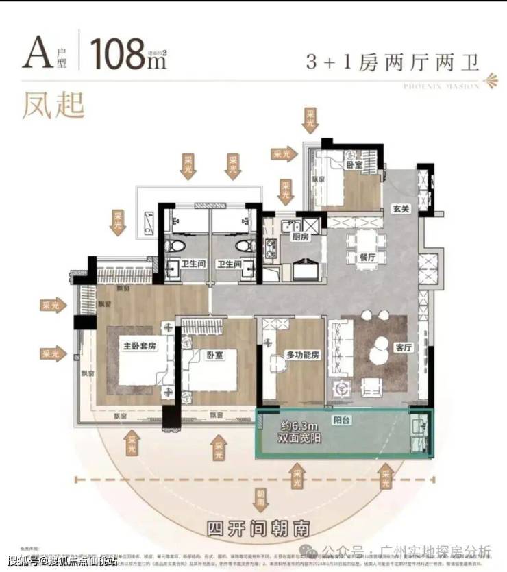 108㎡3+1房两厅两卫,南向四开间 ,约6.3米双面宽阳台,约100%使用率。
