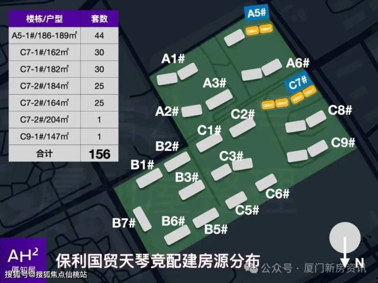 保利国贸天琴竞配建房源共156套,A5号楼1梯186-189㎡44套、C9号楼1梯147㎡1套,C7号楼162-164㎡55套、182-187㎡55套、205㎡1套。