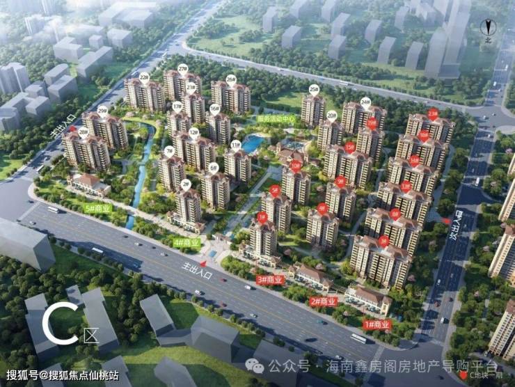 C区鸟瞰图,红色标号为在售房源楼栋