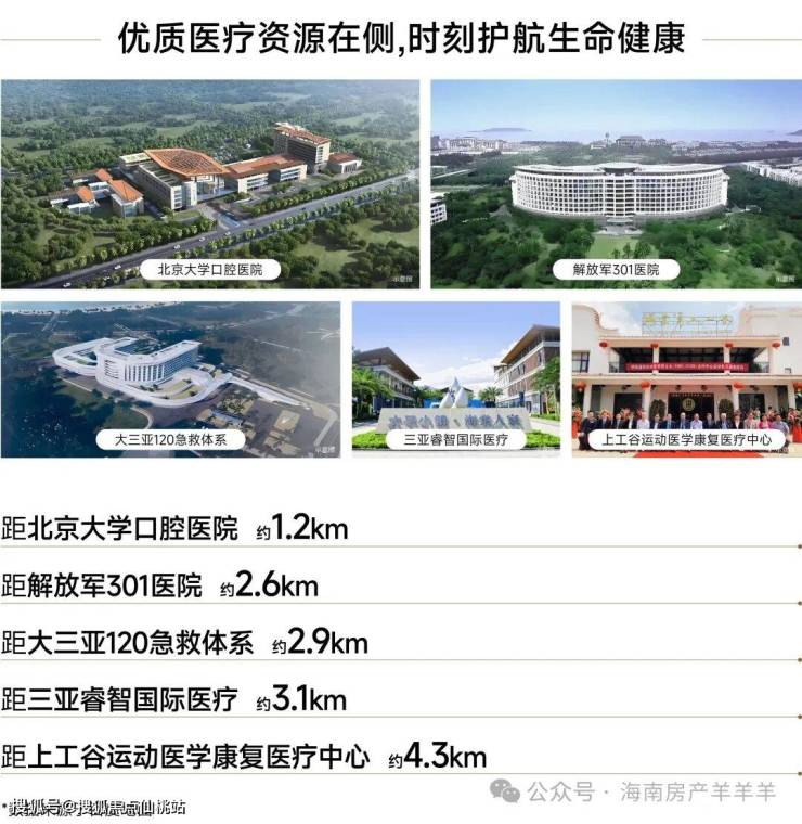 解放军301总院海南分院、北大口腔医院、赫尔曼运动康复医院、上工谷运动医疗康复中心等,业主享全维度医疗资源环伺,为健康筑起安心屏障。