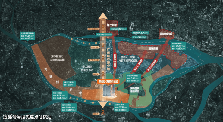 珠光海珠新城位于广州市海珠区南洲街道南洲路与大沙新村东街交叉口东200米处,广州地铁3号线与广佛线交汇的沥滘站附近;属珠江后航道北岸地区,占据广州中轴南端最后1公里,与珠江新城CBD、广州塔共同承载着广州12公里城市中心界面的重磅规划,广州中轴之上最后的塔尖置业珍稀之地。
