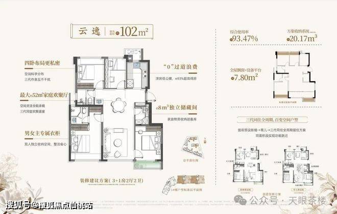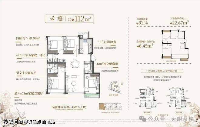 3、户型使用率高。我们在下节详细讲,通常市面高层得房率80%左右,前些年产品更是只有75%,那时82-89平仅能做2房、2+1房,102-113平仅能做3房,如今建发璞云凭借新规迭代+户型优化,户户约90%综合使用率,82-89平做到3房2卫,102-113平做到4房2卫,功能性和舒适性更强!