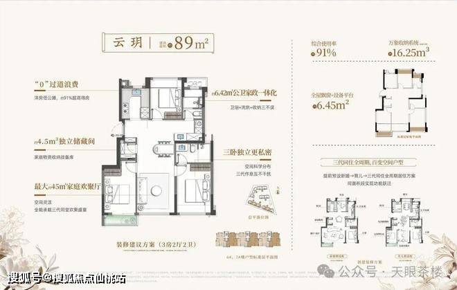 如建发璞云89平窗内实用面积约80平;传统户型89平窗内可用面积(按使用率80%、过道冗余面积4平算)约为67平,多出13平的空间,让整个房间的分区功能面积、收储系统最优化,可节省大几十万的成本。
