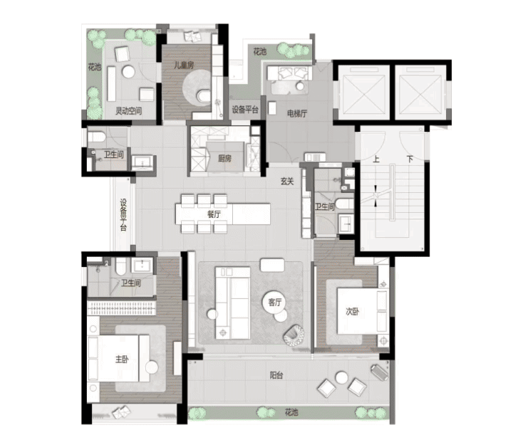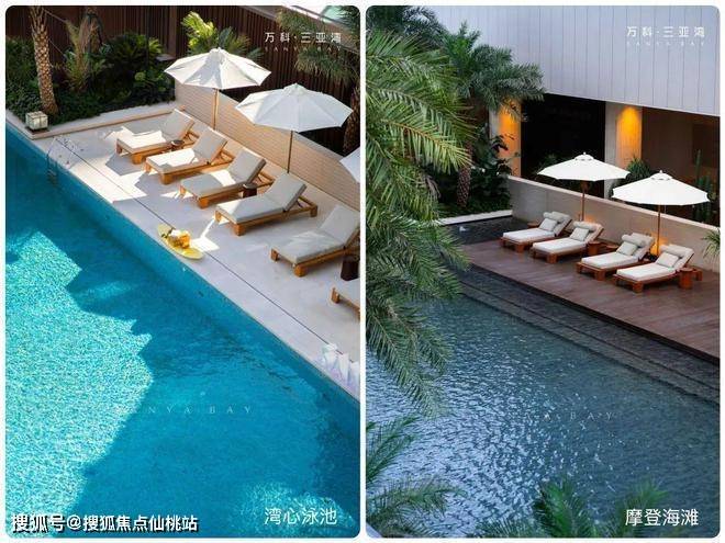为满足不同人群的玩水需求,项目参照国际酒店高标打造了度假双泳池,设置了成年人和儿童分区,营造出热带野奢氛围。摩登海滩的岛屿浮台和湾心泳池的水岸吧台,分别带来不同的度假体验。