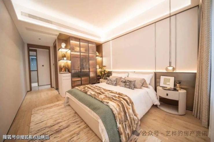 尊贵的主卧则按照星级酒店的高标准打造:3.5米的奢阔面宽搭配南北对流设计,通风和采光效果都属一流;L型步入式衣帽间、全景飘窗等舒适配置一应俱全,让日常的起居生活都尽显优雅与从容。。