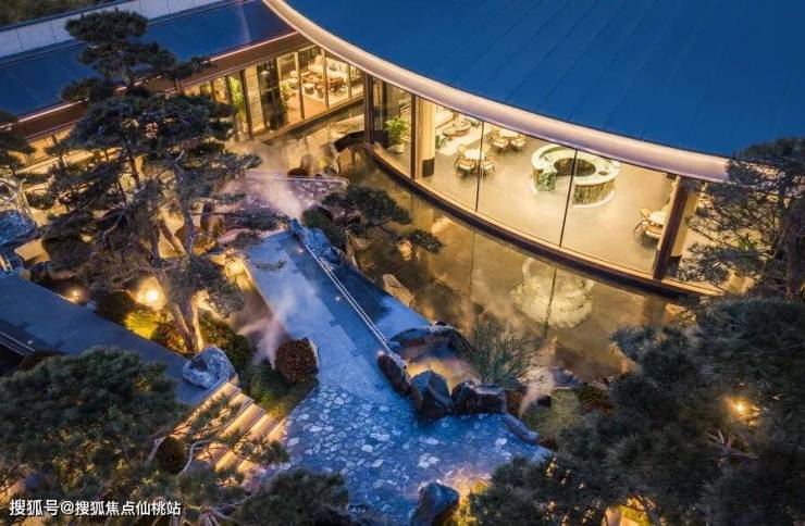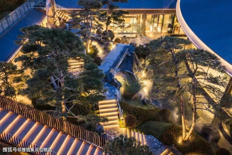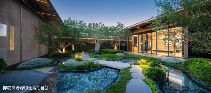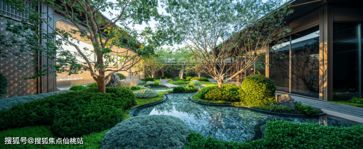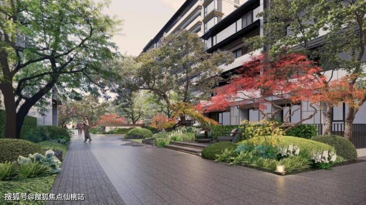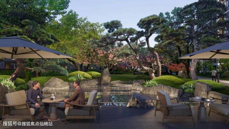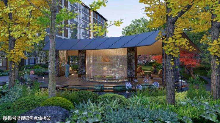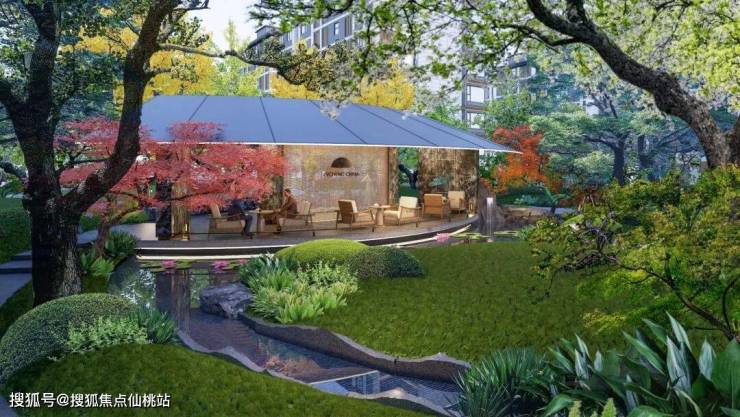 元宝枫、山桃等绿植的加入,充分还原了《桃花源记》中“忽逢桃花林”的场景,表达对美好生活的向往,业主可以在这里放松身心,实现自我的疗愈。