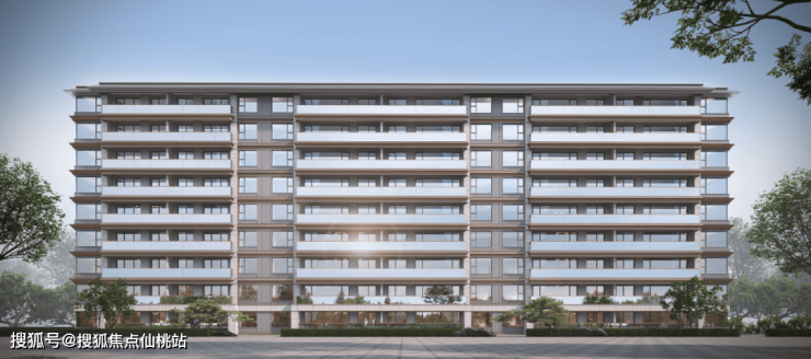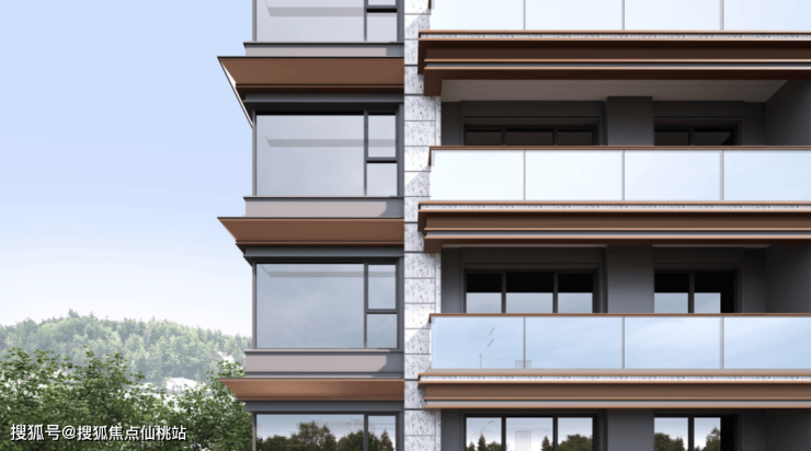南向开敞阳台首开板块先例,玻璃与铝板两种材质的应用,将通透灵动的光幕线条与金属光泽完美融合。叠拼的阳台增加了传统建筑中勾栏构件与竖向立杆,超大窗墙比叠加浓厚的东方韵味,整个建筑既隽永又耐人寻味。