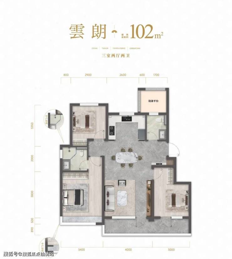 洋房102m²三室户型,最大得房率可到约90%,玄关处有独立的收纳空间,客卫连接的设备平台可以改造成家政间,南向阳台横跨客厅和次卧,主卧飘窗视野开阔,端户位置更升级为转角飘窗,尽享景观最大化体验。