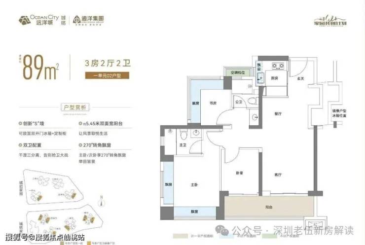 89㎡的3房2厅2卫,02.03户型,设计的是经典竖厅格局,客厅3.4米开间,LDKB一体化,S墙设计预留冰箱卡槽位,动静分区,三开间朝南,3个卧室分别做到了主卧13.79㎡/次卧7.62㎡/次卧6.93㎡(包含墙体飘窗),主卧+1个次卧270°飘窗设计,U型厨房,公卫三段式分离,客厅连接卧室出5.75米长的大阳台,得房率约87.2%(包含赠送),东南朝向。