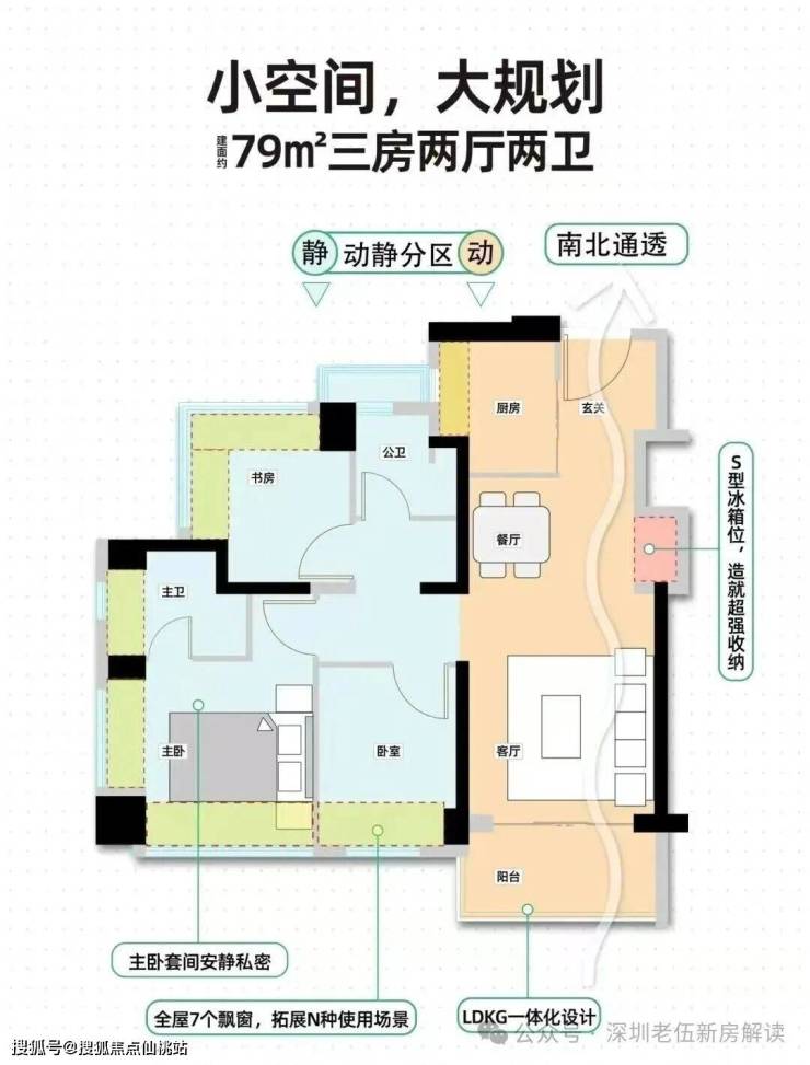 79㎡的3房2厅2卫,设计的是经典竖厅格局,客厅3.3米开间,LDKB一体化,S墙设计预留冰箱卡槽位,动静分区,三开间朝南,3个卧室分别做到了主卧12.1㎡/次卧7.36㎡/次卧6.67㎡(包含墙体飘窗),主卧+1个次卧270°飘窗设计,U型厨房,公卫三段式分离,得房率约88%(包含赠送),东南或西南朝向。