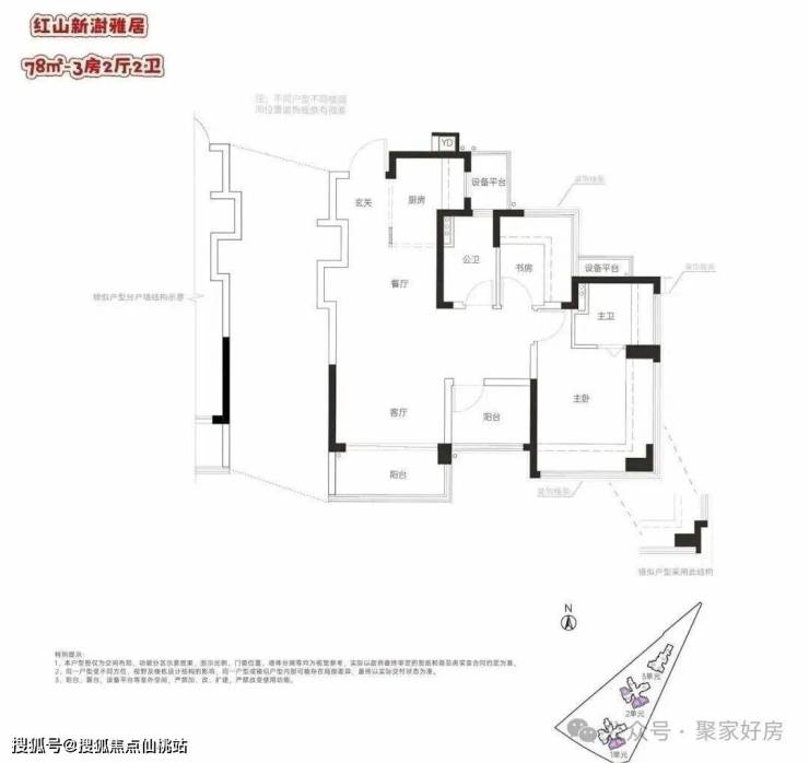 78㎡的3房2厅2卫,设计的是竖厅格局,客厅3.4米开间,LDKG+X空间一体化,S墙设计预留冰箱卡槽位,动静分区,三开间朝南,主卧+1个次卧都是双飘窗设计,次卧带1个设备平台放空调机位,U型厨房,卫生间干湿分离,公卫带1个设备平台可日常使用,得房率:100%(包含赠送),西南或东南朝向。