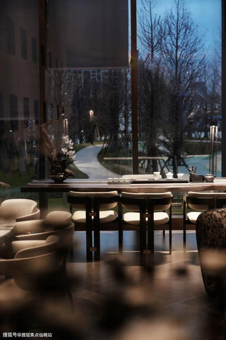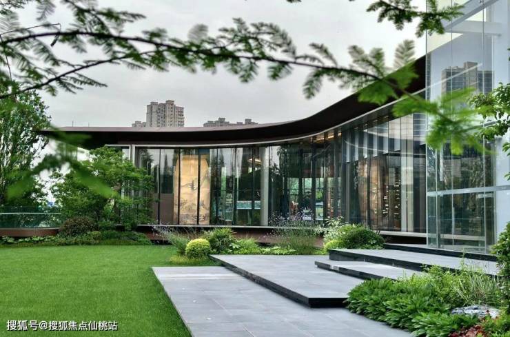 以“江为名、山为序”的创作手法,做成了高低错落、山水相融的花园案场,巧妙地把外部的生态场域,变成了极富有领地感的住区后花园。既构建了互不干扰的空间经营关系,又是对江岸生态体系的友好延伸。