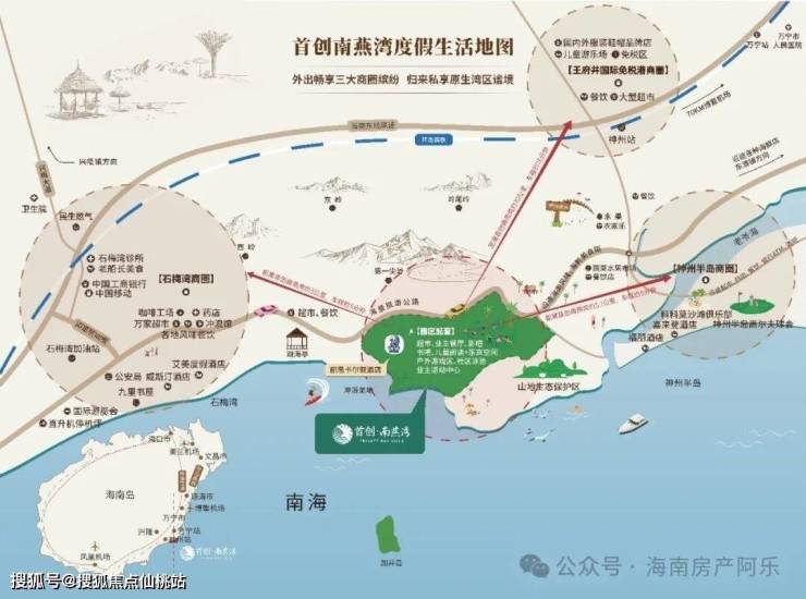沿109公里海岸线分布的日月湾、石梅湾、南燕湾、神州半岛四大海湾,南燕湾位居其中心,近享威斯汀、艾美、君悦等豪华度假酒店、神州高尔夫、游艇码头等醇熟配套,又独享静谧的一线山海,远离喧嚣。