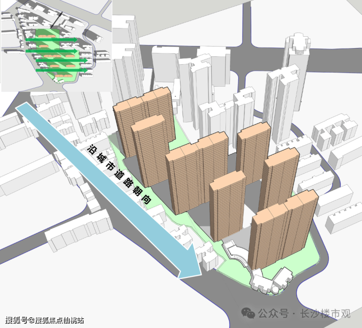 1.项目根据地块形状以及城市道路方向与景观资源条件对建筑进行转角设计,建筑朝东南方向留出视野通廊。