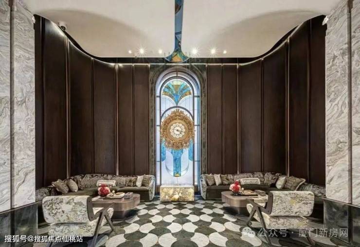 踏入会所大堂,百年时光扑面而来:鼓浪屿风情拱窗、古典鎏金穹顶、镌刻海风纹理的奢石廊柱,水晶灯流转如粼粼波光,老厦门花砖藏着岁月暖意,将湾海灵韵与人文底蕴完美交融。出梯即见“繁花澜境”主题鎏金会客厅,凤凰花雕塑、光影装置搭配祖母绿奢石吧台,格调尽显,无论是商务宴请还是亲友小聚,都能彰显主人的品味与气度,轻松实现圈层社交的从容与体面。