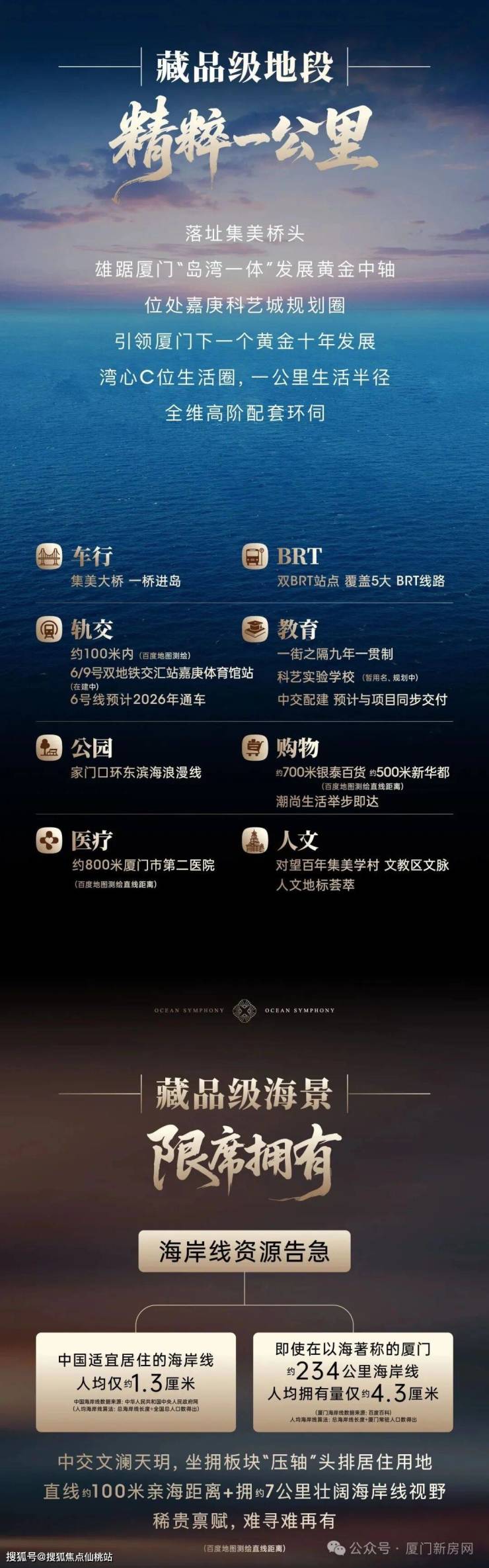 中交·文澜天玥择址集美桥头堡,一桥进岛锚定城央,双地铁+五线BRT构建立体交通网,出行便捷高效,节省通勤时间;直线约700米内,银泰百货、新华都购物广场两大商圈环伺,日常消费举步即达,满足全家生活需求;直线约800米近享集美二院优质医疗,守护家人健康;家门口便是滨海浪漫线,推窗见海,出门赏景。集学校、地铁、商业、医疗、景观于一体的全能配套,在厦门岛外堪称罕有,为生活注入无限便捷与惬意,也让房产更具价值竞争力。