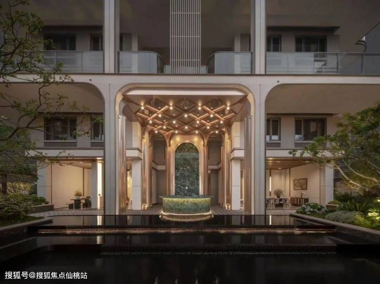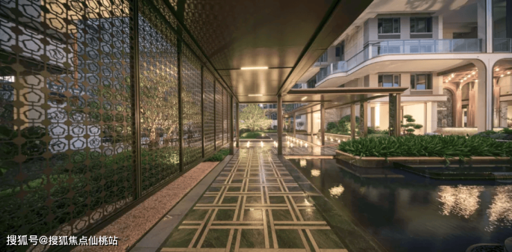 全域风雨连廊系统:连廊悬浮于水院之上,劳斯莱斯星空顶元素与艺术地砖彰显高定品味