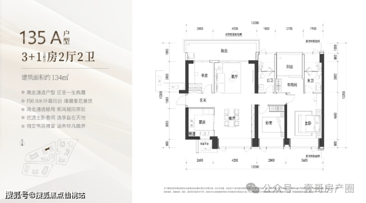 经典的双龙抱珠布局,主人空间与客卧空间互不干扰,具备私密性优势。并且户型方正,实用三房两厅两卫。朝南向四开间面宽共约 13.2m,全明空间,采光极佳。这个户型含赠送半阳台和飘窗的面积后使用率可达约 83%,这在超高层中是比较高的使用率。