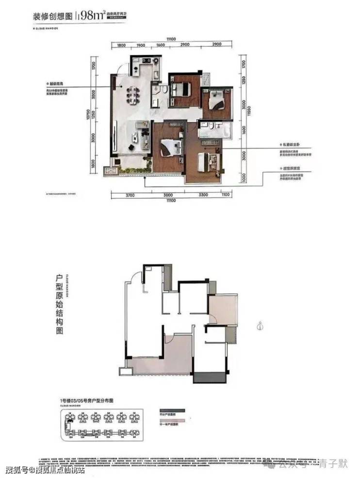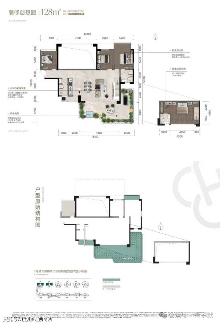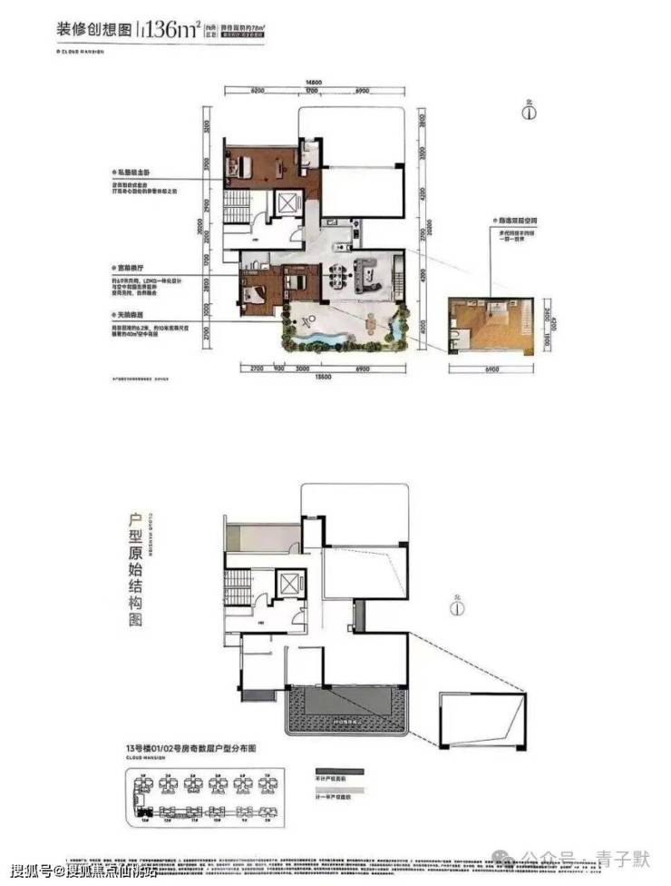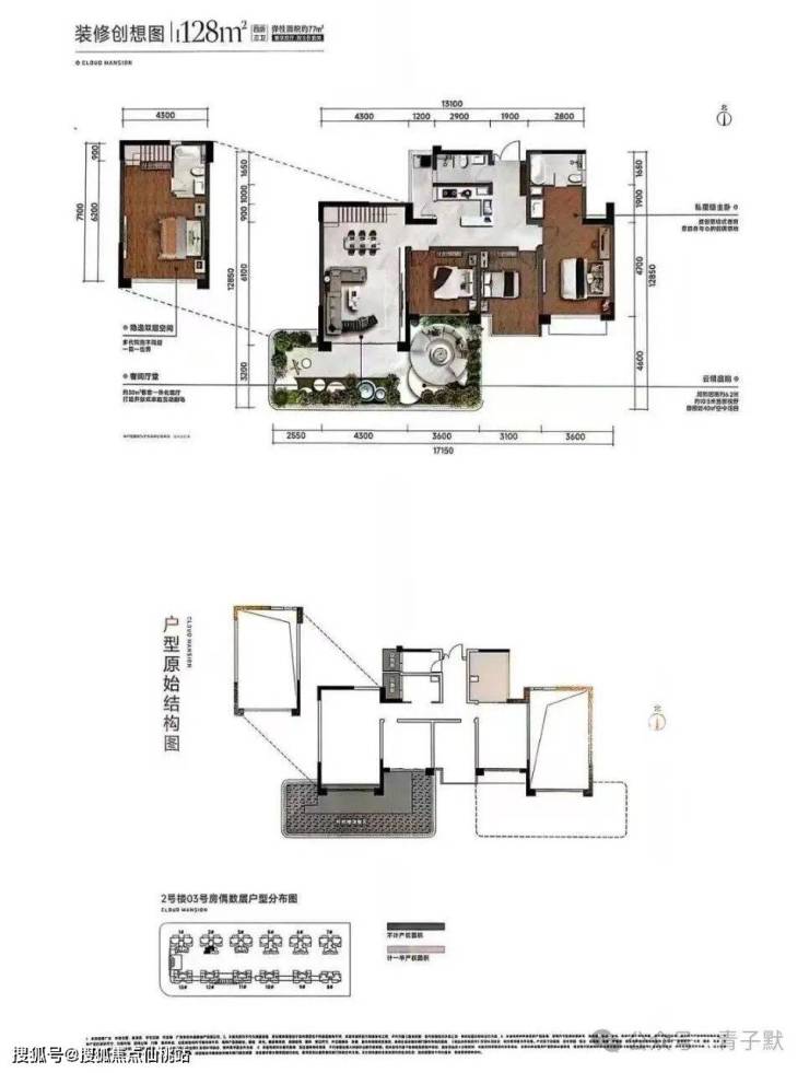 户型面积:约98㎡园景四房(层高3.1米) | 约128-136㎡空中院墅(空中花园及客厅层高6.2米)