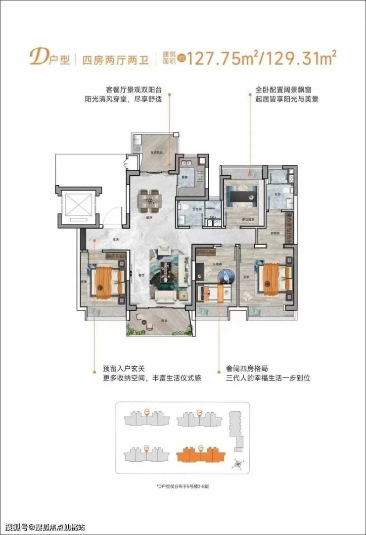 建面约129㎡四房(D户型):双卫浴、双功能阳台、飘窗