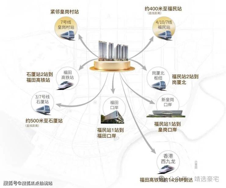 ◎立体交通 畅行湾区 ·1站双口岸 ·2站福田高铁站 ·2站岗厦北枢纽 ·双地铁口 四地铁线 速抵大湾区全域,从容往来深港双城,畅享高效人生。