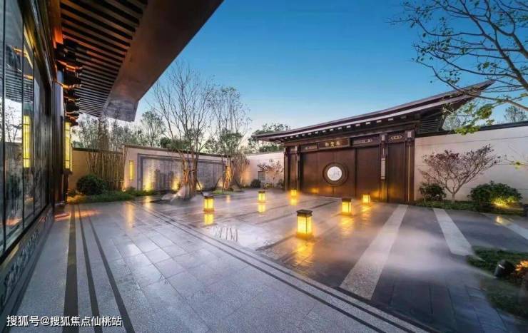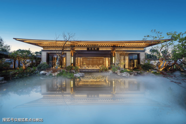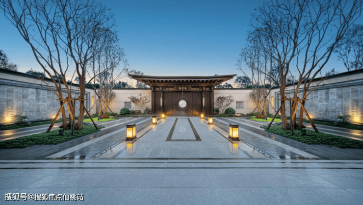 思贤轩面迎清澈溪流,两侧的文化景墙将白居易的《琵琶行》融入其中。步道两侧是精致阵列灯具,灯具立面融入中式的回纹符号,增强了归家仪式感,迎来送往,皆显尊荣。