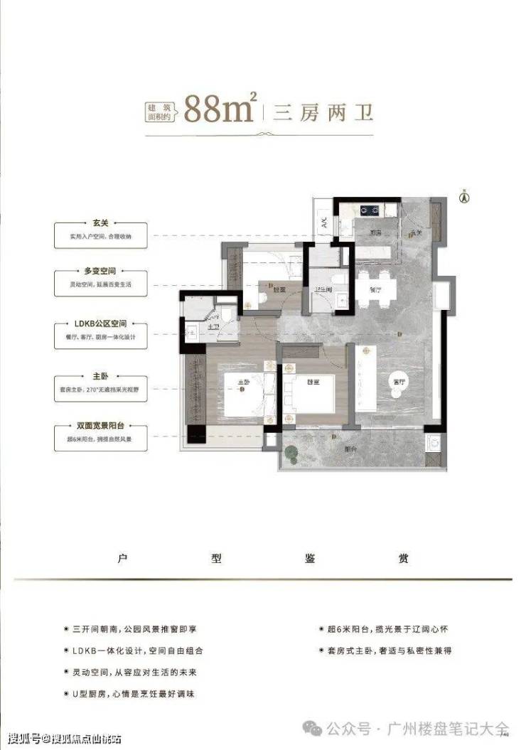 卖点三、【阅山】板块最强三房设计&最高实用率产品【超 100%户型实用率,一步到位三四房】全屋中央空调,打造超 100%实用率高品质户型,户户朝南,板块唯一 78 ㎡南向两卫产品,小户型也能有大享受。