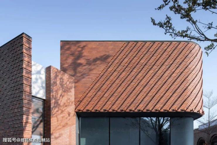 这里通过砖的变化把材料的特点发挥极致,赋予了建筑一个特别别致的外衣。再通过笔挺的金属线条对边缘进行修饰,突出了严谨的工艺感。