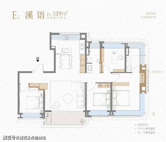 项目建面约128㎡4房户型延续了前作3S墙的设计,保证了收纳空间的丰富性。