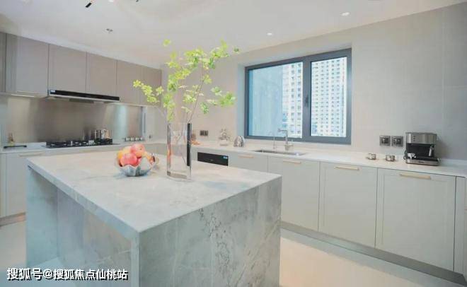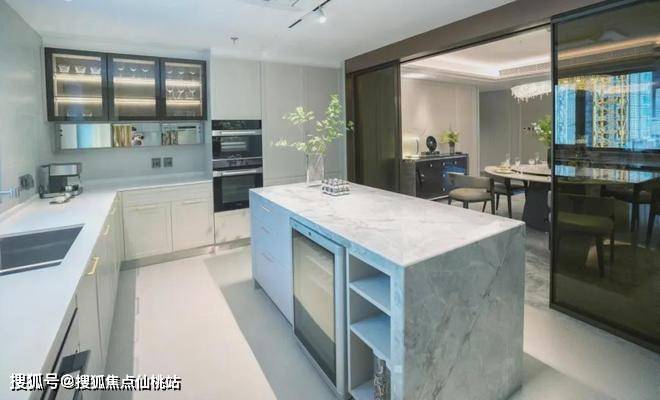 建面约20㎡岛台厨房,精配博世恒温酒柜、德国原装进口Miele品牌烤箱和蒸炉,西门子德国原装进口冰箱、西班牙原装进口洗碗机,优选品牌精配,打造高端人居生活。