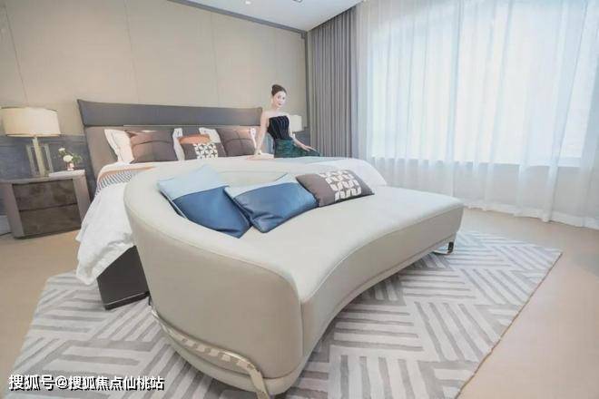 行政套房主卧设计,五星级标准打造寝居、衣帽、卫浴三大空间。主卫采用大浴缸+双台盆设计,精选德国高仪、TOTO高端品牌。全屋奢石铺装,源自土耳其的“芬迪蓝”、白金沙天然石材、蓝金灰石材。