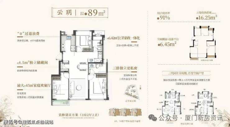 建发璞云主力户型82-113㎡。少量70㎡三房户型,总价300多万,岛内购房低门槛。大胆的纯洋房设计+全飘窗、设备阳台赠送,让综合使用率十分惊艳:89㎡3房2卫,得房率约91%;102㎡户型得房率约93.5%;112㎡户型得房率约92% ,比起高层同等建筑面积户型,实际使用空间秒杀。比如璞云89㎡洋房,按得房率反推,相当于市场上高层100-116平三房。